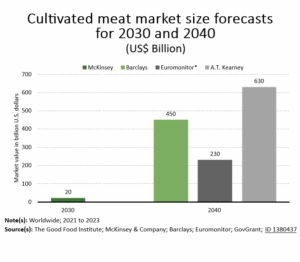 McKinsey projects a positive 2030 forecast for cultivated meat demand, while Barclays, Euromonitor, and A.T. Kearney see a much larger market for these products by 2040.