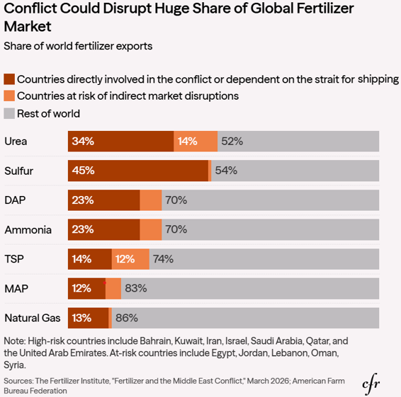 The larger spoken worry so far in agricultural circles centers on the flow of essential nitrogen, phosphorus, and sulfur to make phosphorus. The Middle East supplies over one-third of all global nitrogen fertilizer, according to the American Farm Bureau.
